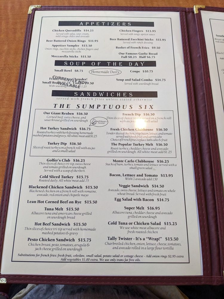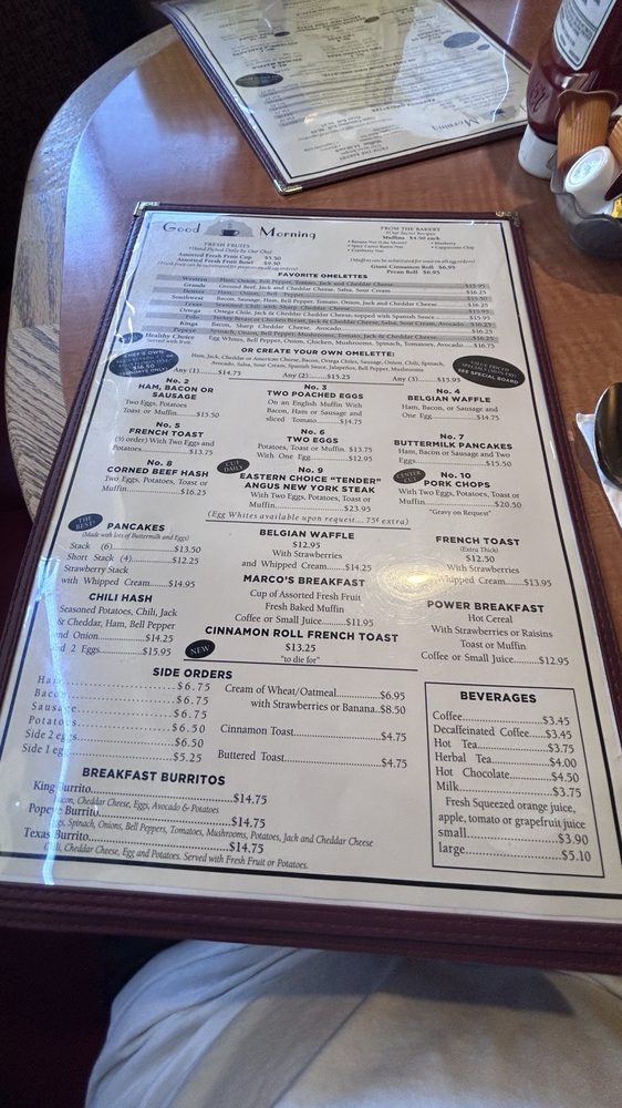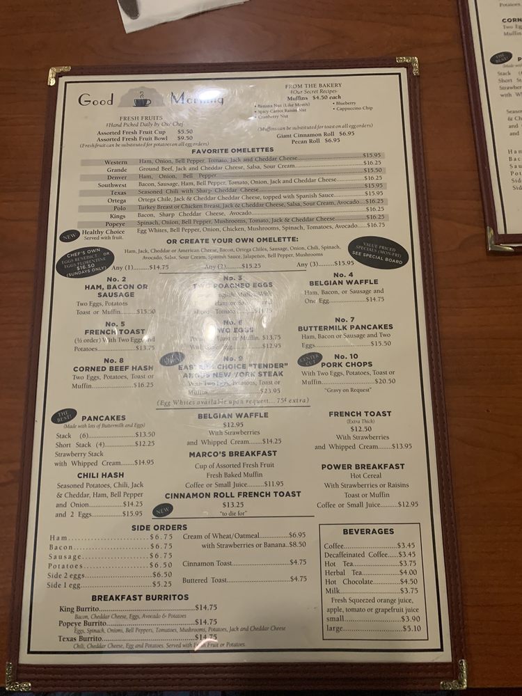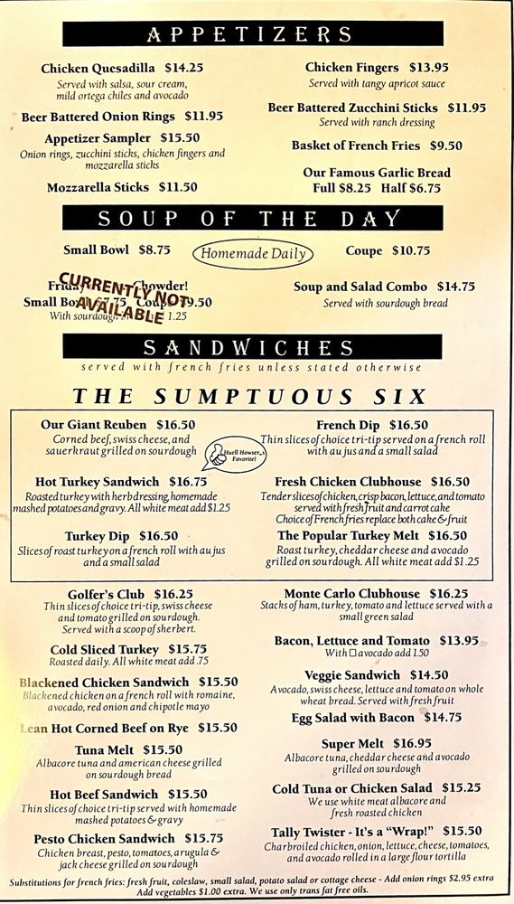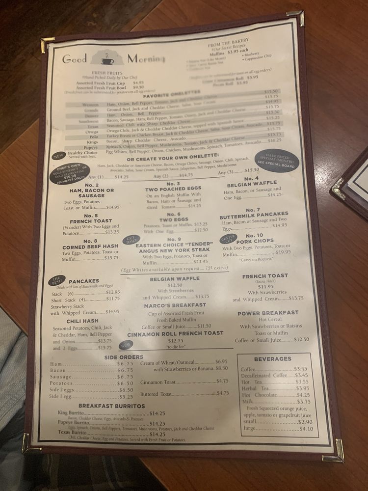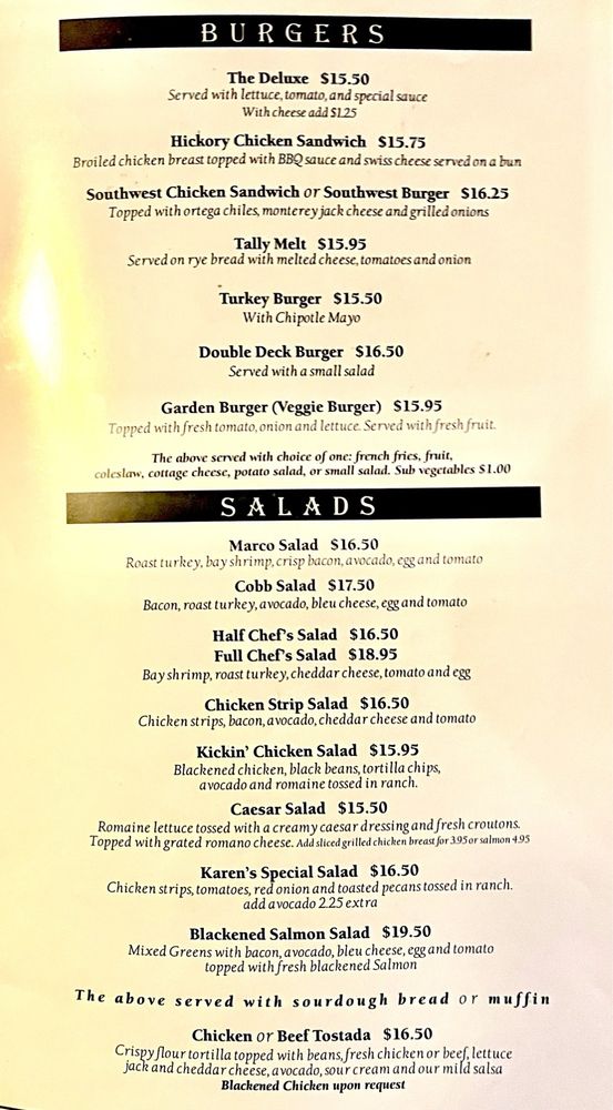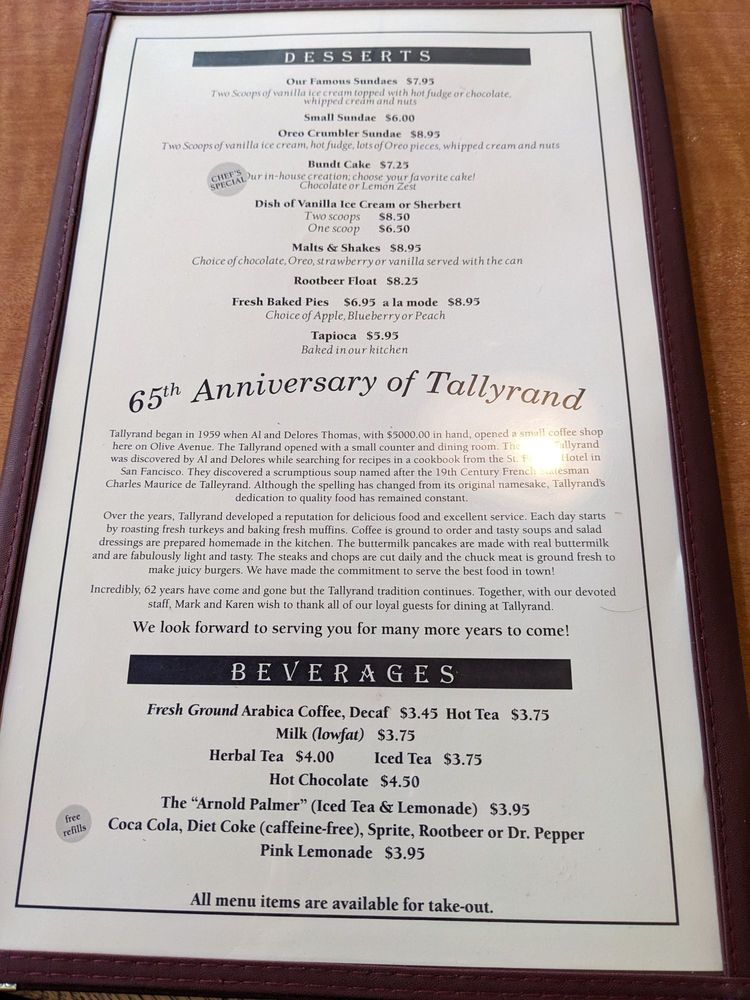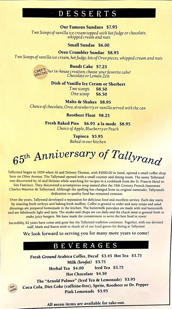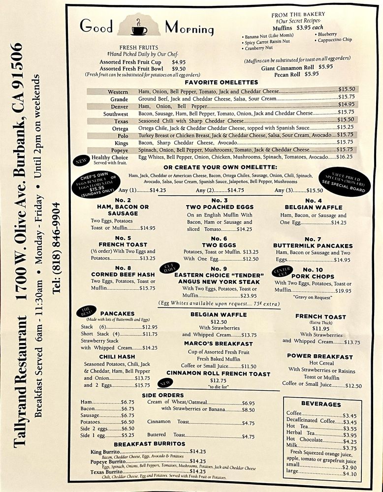 Introducing the menu at Tallyrand Restaurant, a cozy diner in Burbank, CA, specializing in American breakfast and brunch options. With a wide range of breakfast combos, like Pork Chops with eggs and toast, and delicious offerings like Eggs Benedict on Sundays, Tallyrand caters to all taste preferences. Their extensive omelet selection includes unique creations like the Healthy Choice Omelet and the Popeye Omelet, ensuring there is something for everyone. Customers rave about the fluffy pancakes, crispy waffles, and savory corned beef hash. Tallyrand's retro atmosphere and friendly service make it a favorite spot for locals and visitors alike. Don't miss out on their famous Cinnamon Roll French Toast or hot turkey sandwiches. This iconic eatery has been serving up comforting classics since 1959, making it a must-visit for a nostalgic dining experience.